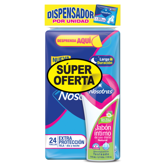 Este pack de oferta incluye un jabón íntimo Nosotras con extracto de rosas de 200 ml y toallas íntimas adicionales. El jabón está formulado con ingredientes suaves que respetan el pH natural, proporcionando frescura y cuidado diario. Su fragancia delicada de rosas brinda una sensación de limpieza prolongada. Las toallas íntimas complementan el cuidado, ofreciendo comodidad y protección durante todo el día.