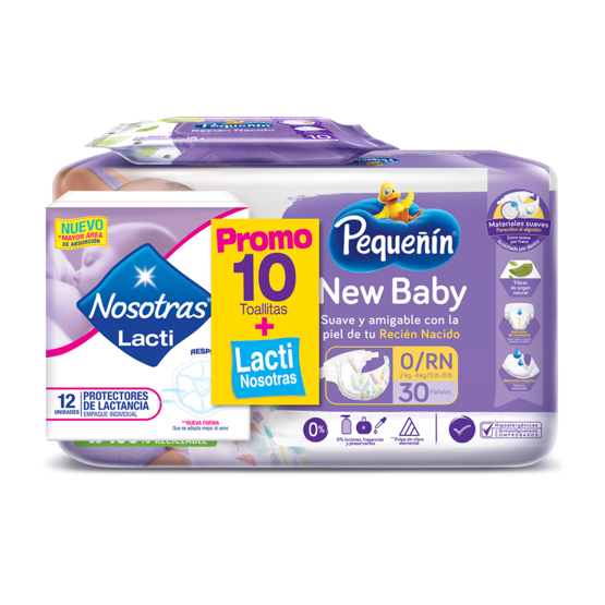 Pañal Pequeñín Recién Nacido x 30 Pañales + 12 Protectores Lacti + 10 Toallas Recién Nacido