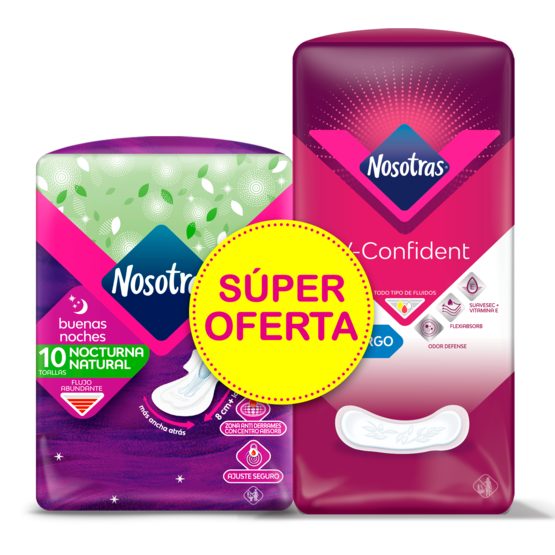 Oferta (Toalla Higiénica Nosotras Buenas Noches x 10Toallas + 24 Protectores V-Confident Largo)